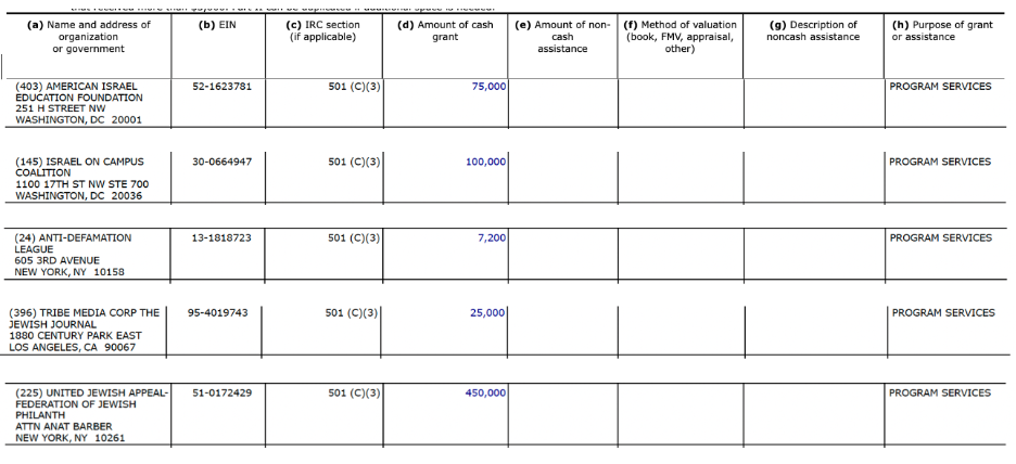A review of the reports filed for the fiscal year ending June 2024 shows that Columbia allocated funds to multiple organizations whose missions and activities are aligned with pro-Israel political advocacy, leadership development, and media.